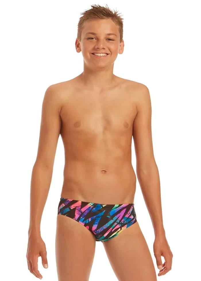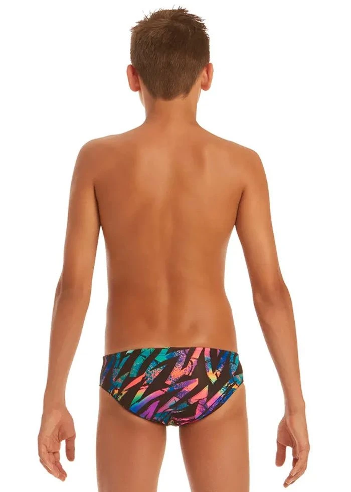 The new boy’s AMANZI Liquid Storm swimming briefs are the perfect choice for regular pool use, they feature flashes of neon reds, purples and greens against a black base.
