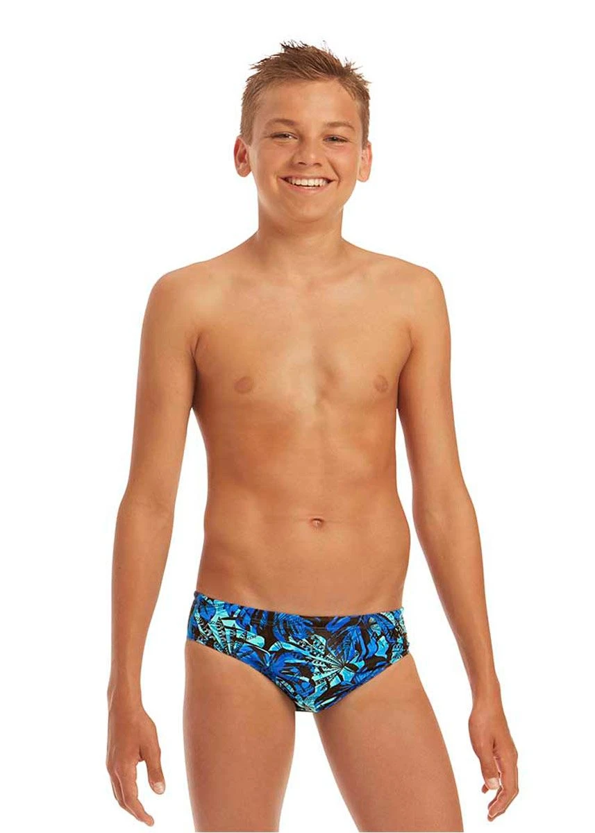 The new boy’s AMANZI Troposphere briefs are the perfect choice for regular pool use, they feature a tropical blue Palm leaf print.