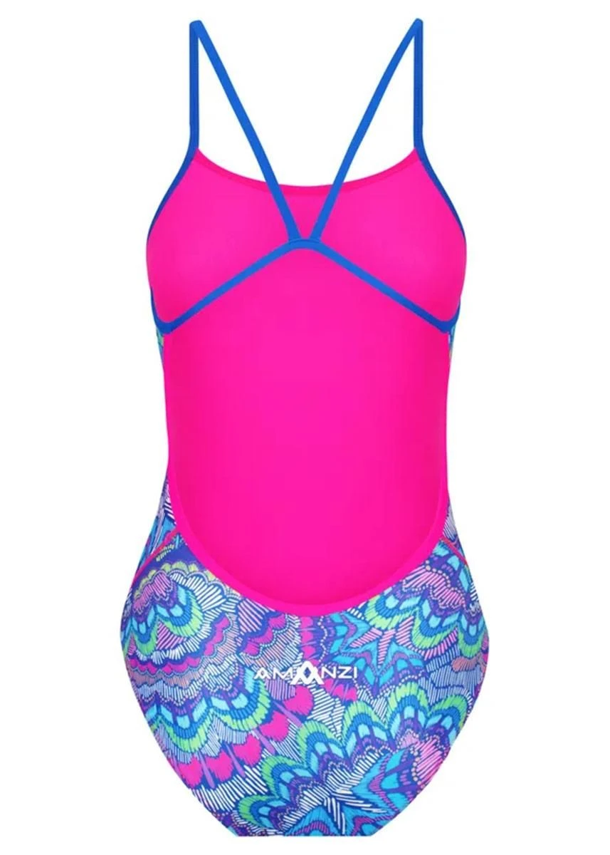 The AMANZI Fiesta Proback One Piece features a Mexican inspired print that is a vibrant explosion of neon colours, reminiscent of the bursting fireworks on a festive night. The intricate design captures the essence of Mexico boasting bold hues of fuchsia, turquoise, and lime green, and orange creating a playful and lively look. This print is sure to make a statement and bring a touch of fiesta flair to any summer day.
