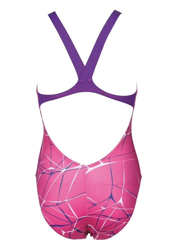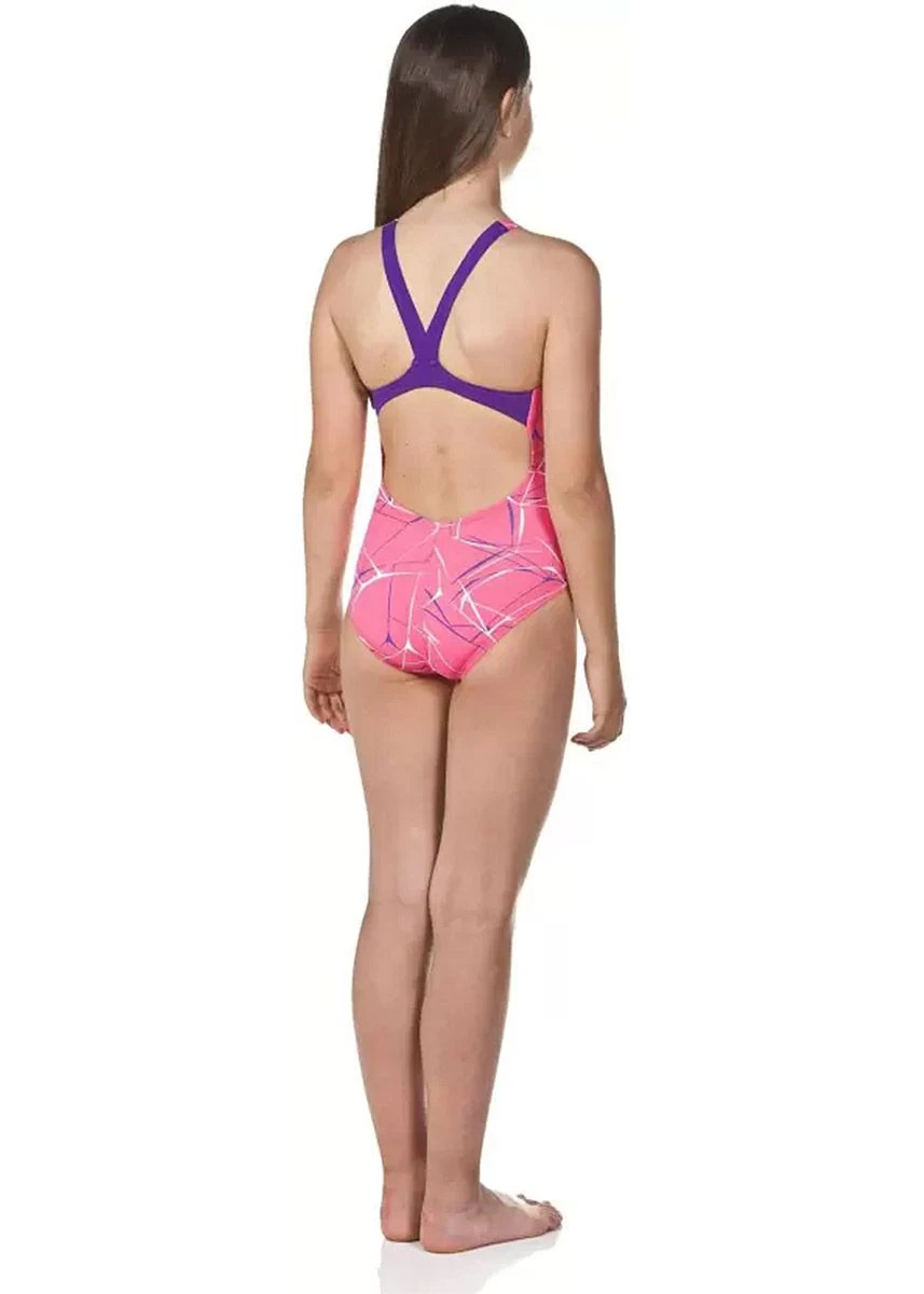 A great choice for regular training sessions and leisurely trips to the pool, this Arena girls swimsuit has been printed with a vibrant pink “water” print designed to look good both in and out of the water.
