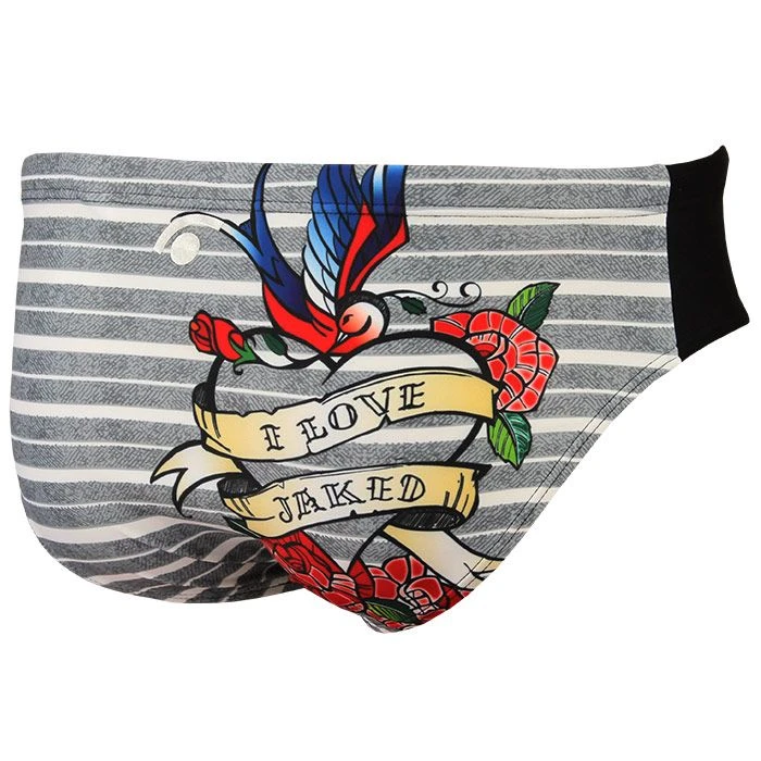The Jaked Junior Love Swim Briefs – Grey / Black features a plain black frontal fabric and a colourful grey stripped back print with an ‘I love Jaked’ golden banner, alongside a beautiful rose & bird to produce a swimsuit that is very eye-catching and durable.