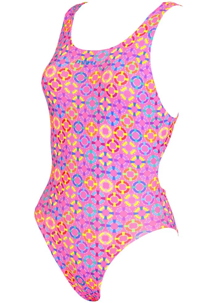 The Maru Girls Lifesaver Swimsuit from Maru Swimwear features a colourful and unique circle print.