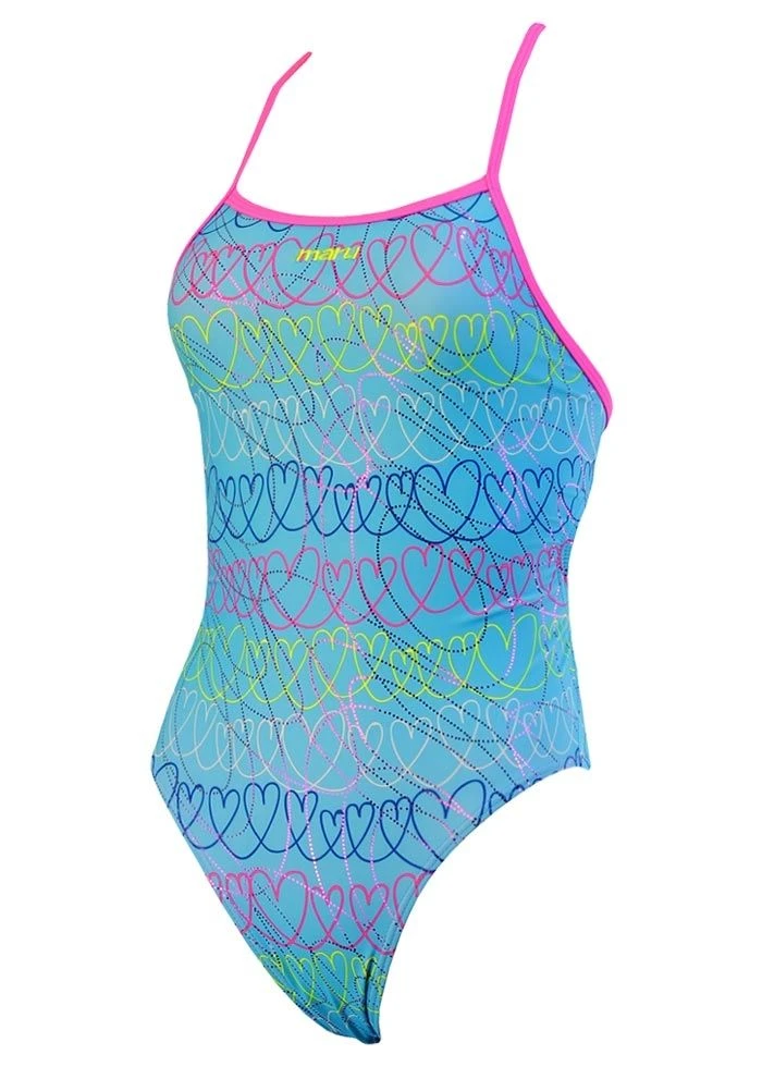Your daughter will love the girl’s loveheart swimsuit by Maru featuring a light and flowing heart print.