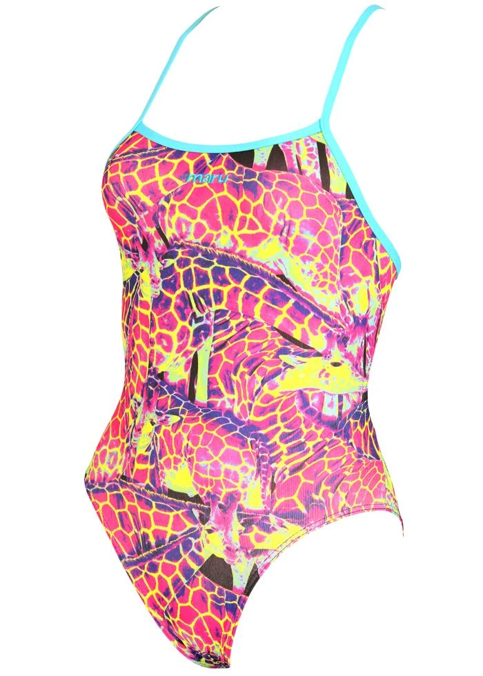 The Neon Giraffe Costume is made with Maru’s Pacer material which provides 100% Chlorine and UV resistance for a more durable swimsuit!.