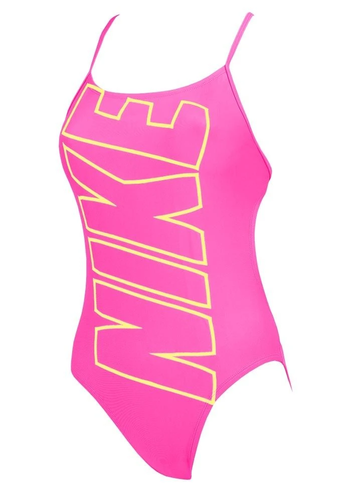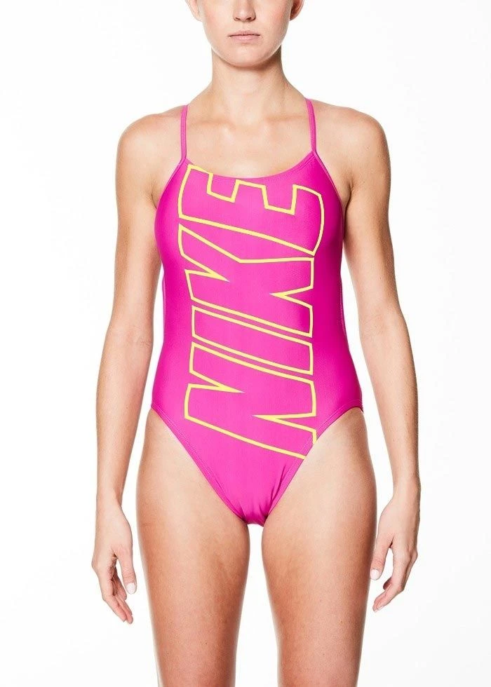 This girls swimsuit has been printed with Nike’s famous “Nike” font covering the entire front, making it a very fashionable swimsuit.Â