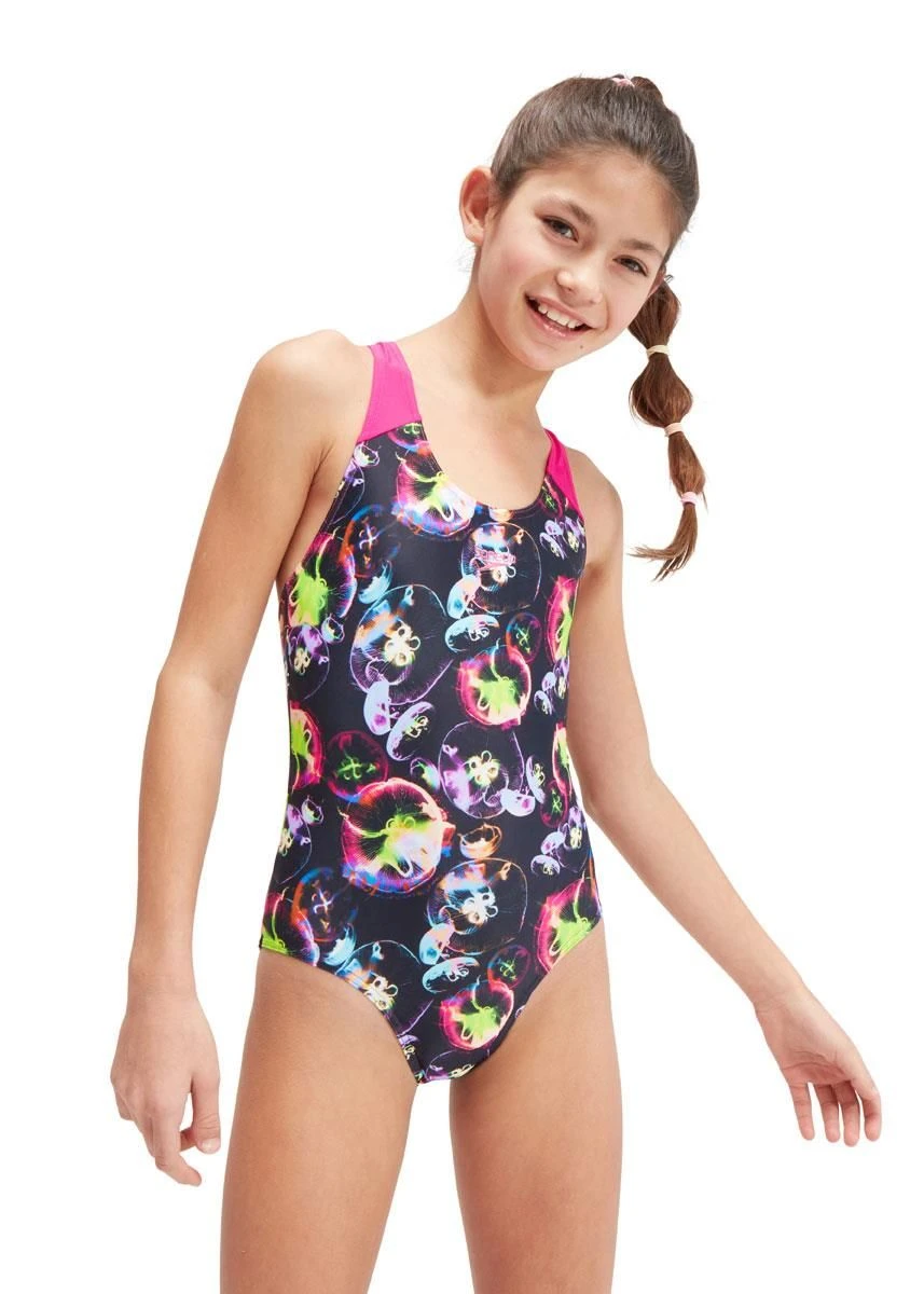 With its hyper-real jellyfish print, this show-stopping Splashback swimsuit is a fun choice for training and lessons. The splashback design includes straps set away from the shoulders to increase freedom of movement, allowing young swimmers to train without feeling restricted. Ideal for regular pool sessions, Speedos ECO EnduraFlex fabric offers higher chlorine resistance than standard swimwear fabrics and fits like new for longer with CREORA® HighClo™. In addition, nylon yarns in the EnduraFlex fabric are made from 100% pre-consumer waste, such as waste fabric from factories.