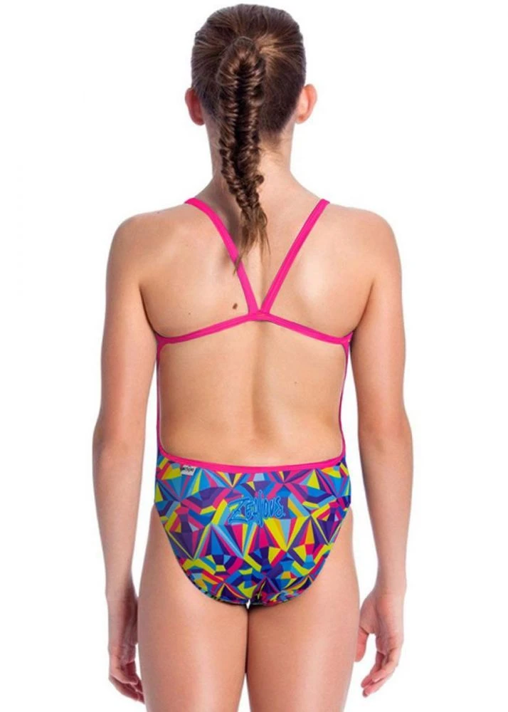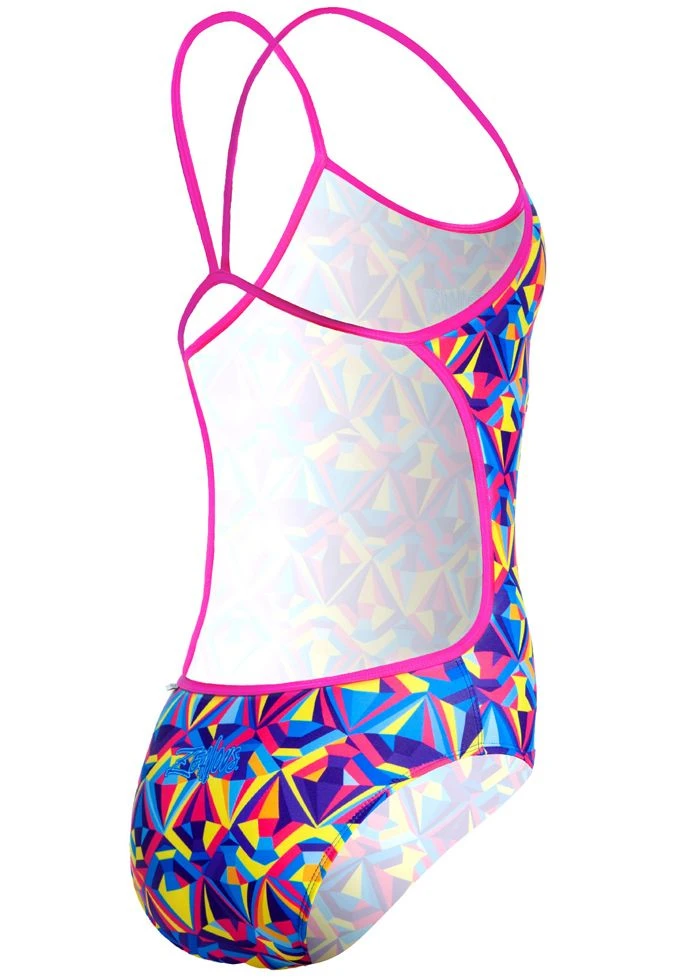 The Zealous Sherbet Sparkle Girls Thin Strap One Piece Swimsuit Swimsuit features a multicoloured diamond shaped kaleidoscope inspired pattern.