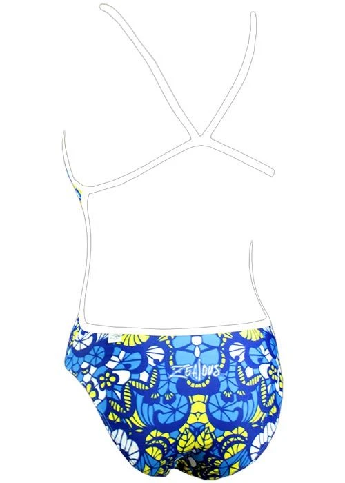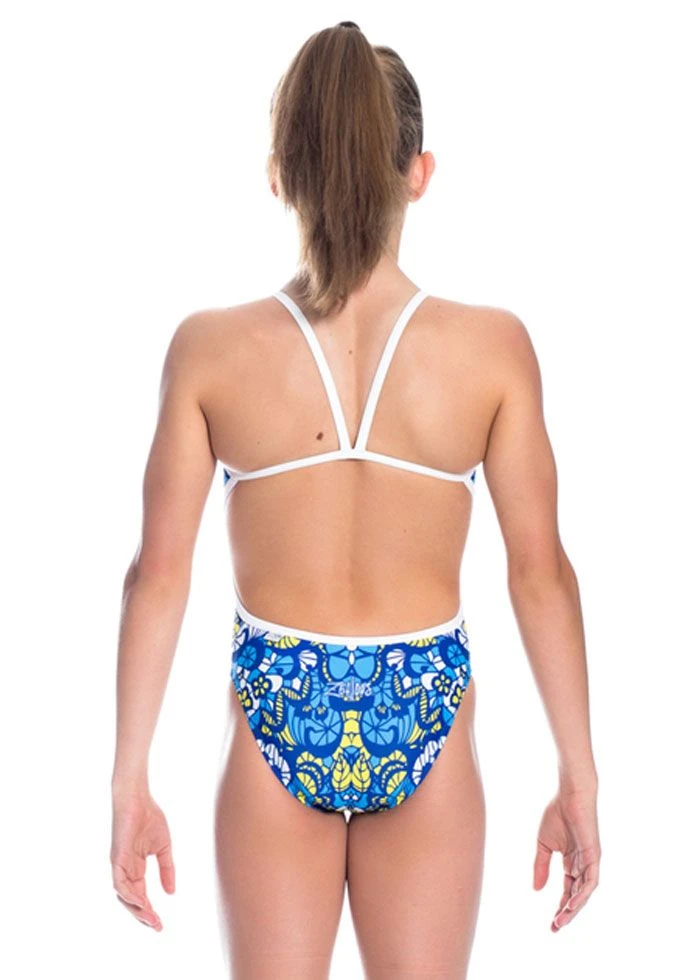 Zealous Swimwears main focus is to deliver passion and flare within their swimming products. Feel the happy vibes with the Girls Slap Happy costume, this bright and inspiring one piece swimsuit. Featuring shades of blue and finished with highlights of brilliant yellow and crisp white.